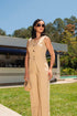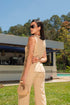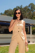 A blusa sem mangas com botões imponentes na frente une modernidade e elegância, enquanto a calça de caimento reto alonga a silhueta com um toque refinado. O corte preciso e o acabamento impecável valorizam o corpo com discrição e requinte.