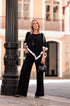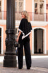 - Calça boca pantalona com boca de sino que dança com seus passos