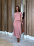 A saia midi plissada valoriza a silhueta e adiciona sofisticação ao visual, com um toque feminino e fluido que acompanha cada passo com delicadeza.