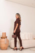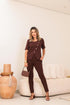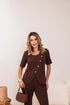 Conjunto em moletinho gramatura 300 se destaca pelo design moderno e sofisticado. A blusa, com decote arredondado, surpreende com uma fileira de botões aplicada na diagonal. A calça complementa o look com um detalhe de martingale e botões na região do bolso.