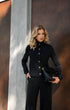 Botoes em massa degrade e detalhes de costuras em trançadeira nos bolsos e no recorte das costas. Bolsos frontais na blusa e recortes com detalhes de trancadeira
