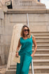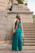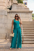 A calça é pantalona fluida, com movimento elegante e caimento solto desde o quadril, alongando a silhueta e oferecendo liberdade total