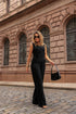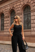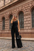 A calça é pantalona fluida, com movimento elegante e caimento solto desde o quadril, alongando a silhueta e oferecendo liberdade total