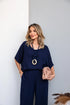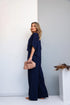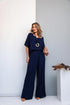 A blusa possui decote arredondado e mangas amplas, garantindo leveza e movimento. A calça de cintura alta com cós estruturado valoriza a silhueta e oferece uma fluidez elegante ao andar. O tecido em linho com elastano proporciona frescor, maleabilidade e sofisticação natural.