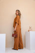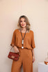 A blusa possui decote arredondado e mangas amplas, garantindo leveza e movimento. A calça de cintura alta com cós estruturado valoriza a silhueta e oferece uma fluidez elegante ao andar. O tecido em linho com elastano proporciona frescor, maleabilidade e sofisticação natural.