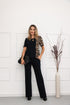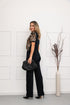 Um conjunto que une sofisticação e personalidade em cada detalhe. Confeccionado em malha viscolycra de gramatura (290), proporciona um caimento estruturado com extremo conforto. A blusa de gola redonda com mangas curtas traz uma proposta moderna com estampa assimétrica marcante, enquanto a calça de corte reto com nervuras frontais, bolsos e cós elástico estampado valoriza a silhueta com elegância.