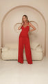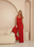 A calça é pantalona fluida, com movimento elegante e caimento solto desde o quadril, alongando a silhueta e oferecendo liberdade total nos movimentos.